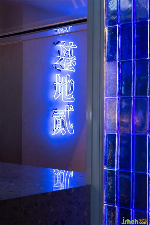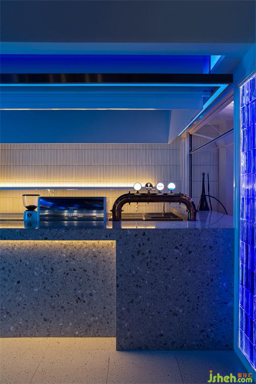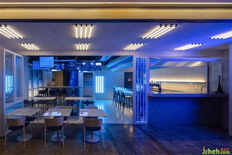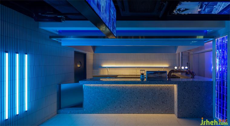 在空間邏輯上,OFT設(shè)計用“自下而上”、“循序漸進”的酒吧設(shè)計手法連接兩層空間;在視覺上,藍白兩種冷色則以一種最直接的方式,將賽博朋克風(fēng)格中的冷峻與科幻發(fā)揮到極致。