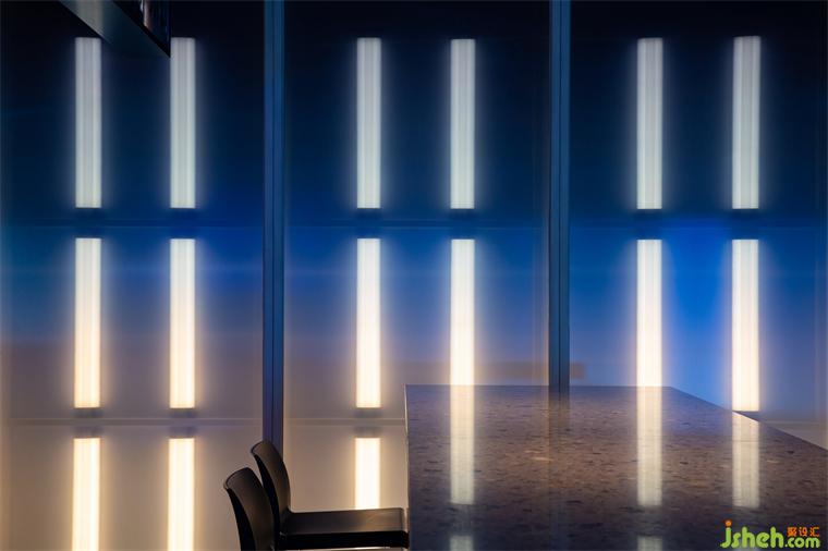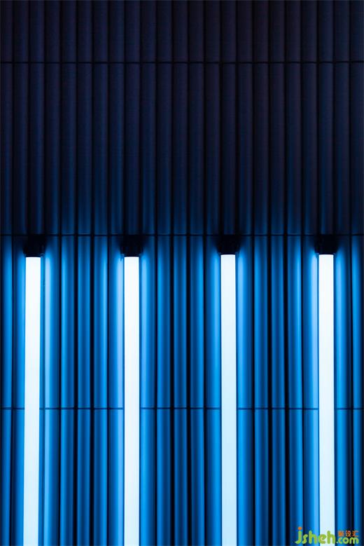 墻面以立體磚與燈管構成,除了增強墻面立體感,縱向的排列方式也能從視覺上延伸層高。