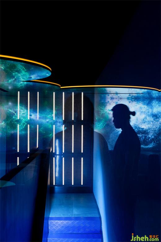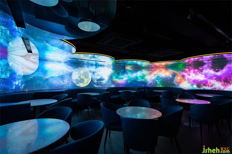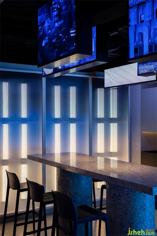 在這個125㎡的空間中,設計師運用玻璃、立體磚、燈管、LED電子屏等多元物料進行對比,酒吧設計構建出豐富的空間層次,讓消費者可以體驗一種交感幻象,以此回應賽博空間的復雜性。