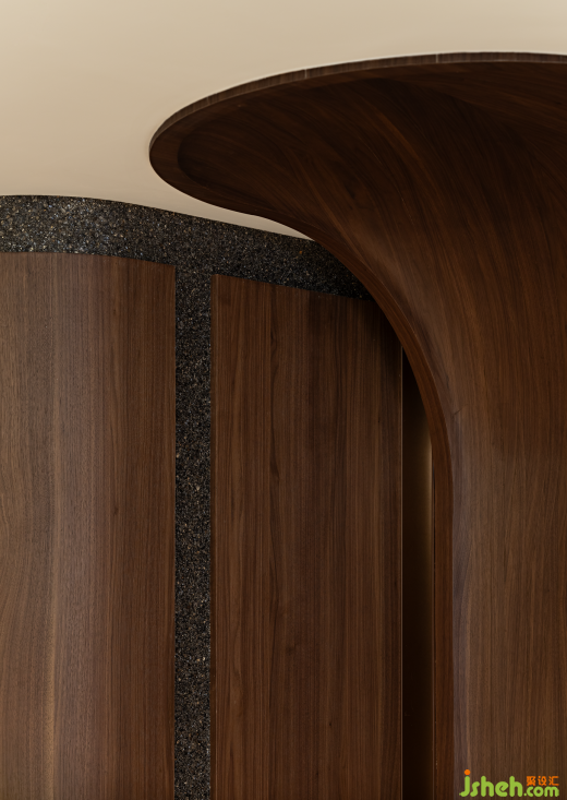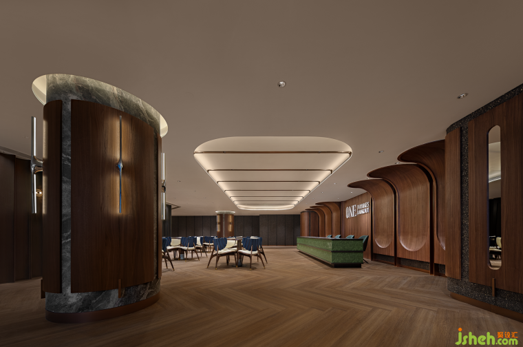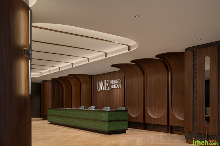 除了功能性,在設(shè)計(jì)細(xì)節(jié)上,同樣經(jīng)得起推敲,空間中不同材料相互映照,隱喻中西文化在此交匯,生長(zhǎng)出新的文化精神與內(nèi)核。而突破兩個(gè)平面規(guī)則的墻面造型,則預(yù)示著英皇地產(chǎn)不斷尋求突破與創(chuàng)新的品牌發(fā)展軌跡。