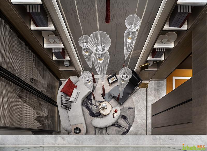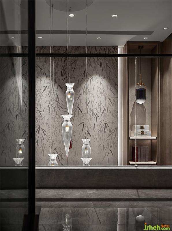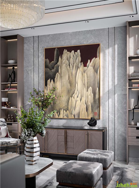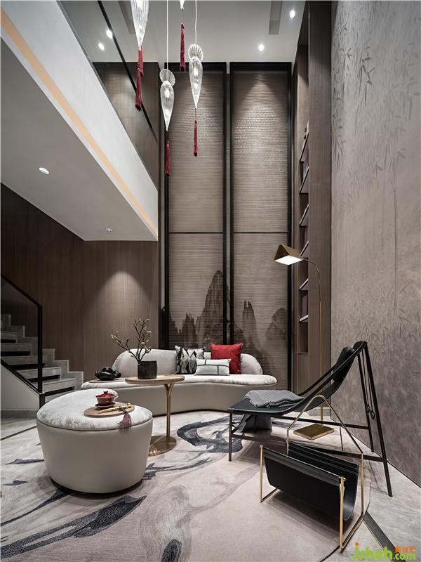 負(fù)一層起居室的挑高空間里里,蔓延出山水意境的休憩區(qū)域。雙樓層間的挑高墻面,拉升山水圖置立面上,延續(xù)細(xì)膩東方依山傍水有意境。隱約如屏的壁畫(huà)與錯(cuò)落水晶吊燈互為挑高空間視覺(jué),在當(dāng)代美學(xué)中窺見(jiàn)境界。山水錯(cuò)落有相逢,琳瑯滿目有閑情。豐富的東方裝飾性,雅致了整個(gè)空間質(zhì)感。別墅裝飾