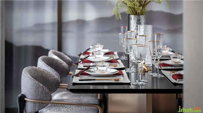 簡潔雅致的用餐空間,設計中延續(xù)山水視覺,以灰階淡彩登堂。廚房與餐桌相隔有山水淡墨色拉門。餐柜置中點綴流線山水畫,畫作雙邊以鐵件裸柜的對稱型式裝置,打造開放式主墻視覺,干凈利落的風格,更顯通透。