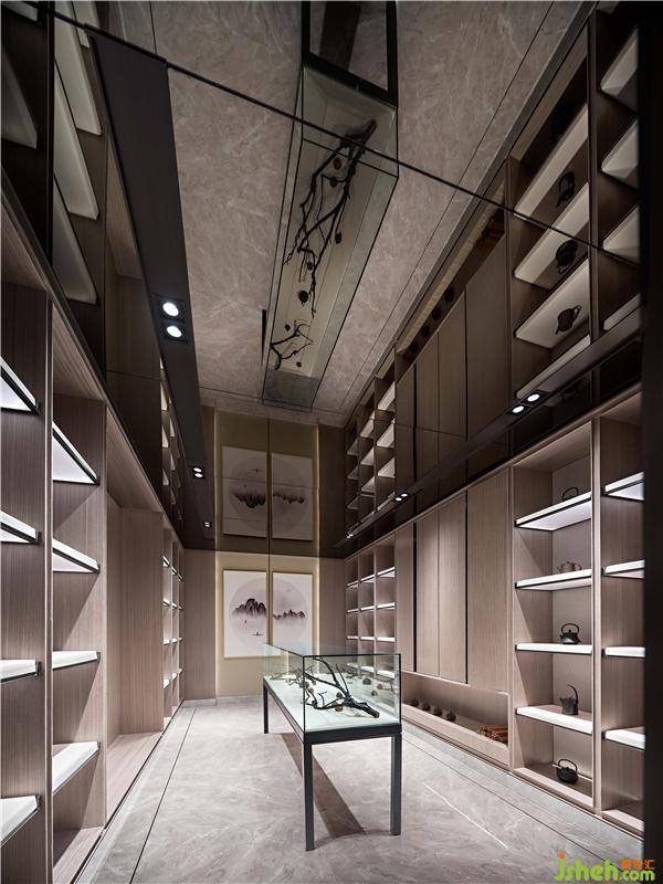 "茶者,南方之嘉木也。" 茶室形象牆上,以唐代陸羽的"茶經"詞句,帶出展示間主題。透亮光彩的茶室形象展示間,蒐藏展示業(yè)主多年精心的茶壺蒐集,有各式材質,玲瓏剔透的藝術精品,展現屬于東方茶道文化的風采??臻g以亮度映射天花板鏡面,放亮空間色澤照明。層板片內坎燈源為大空間帶來光澤序列,提升展示物的細膩與質感。別墅裝飾