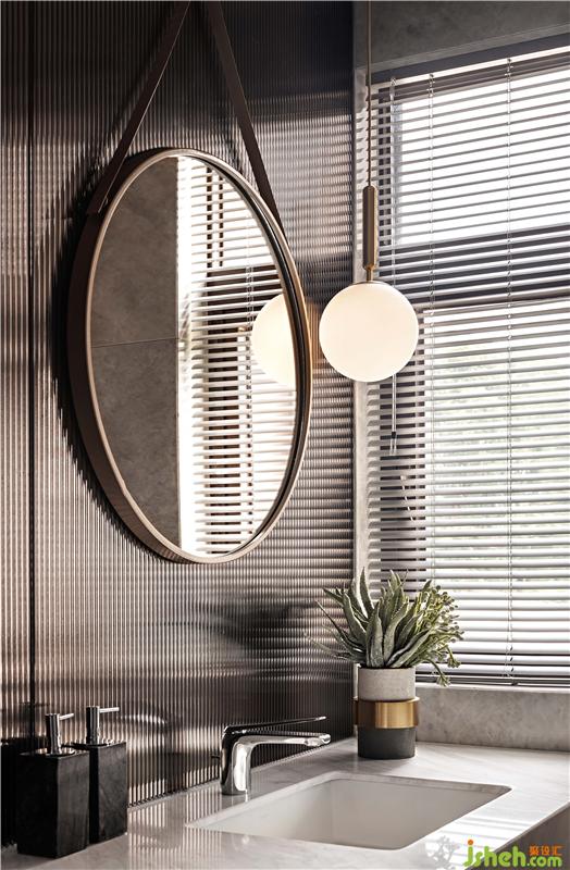 日光照進(jìn)洗手臺立面,以直向線條呼應(yīng)右側(cè)百葉格柵的橫向光線,直橫交錯間對比出簡約活潑感。低彩的咖啡霧金屬配搭大理石臺面,兩者內(nèi)斂的光澤彼此交融著永恒的細(xì)膩氣質(zhì)。
