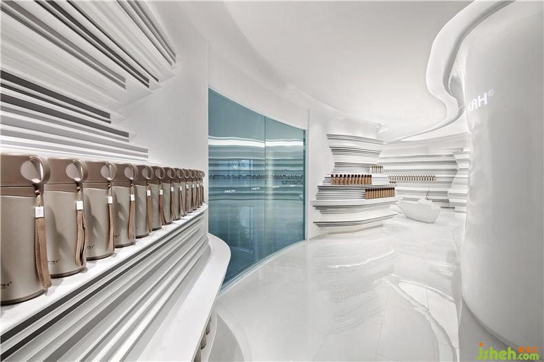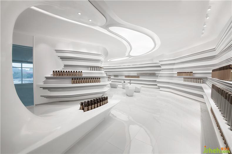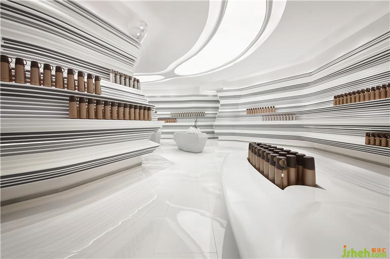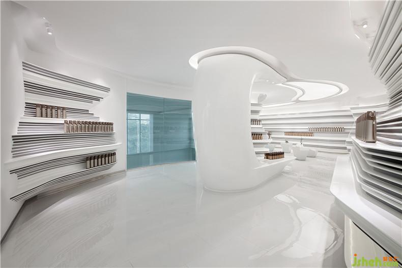 整個展廳靈感來源于設(shè)計師對大自然生活的體驗與感恩,墻身層層的凹凸肌理以及顏色變化,如同巖石經(jīng)過風(fēng)化的洗禮,創(chuàng)造出現(xiàn)代感與未來感等不一樣的視覺感受?;⌒?、流線型把展柜與空間有機(jī)的結(jié)合,使整個空間流暢、靈動且具有張力