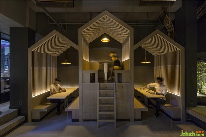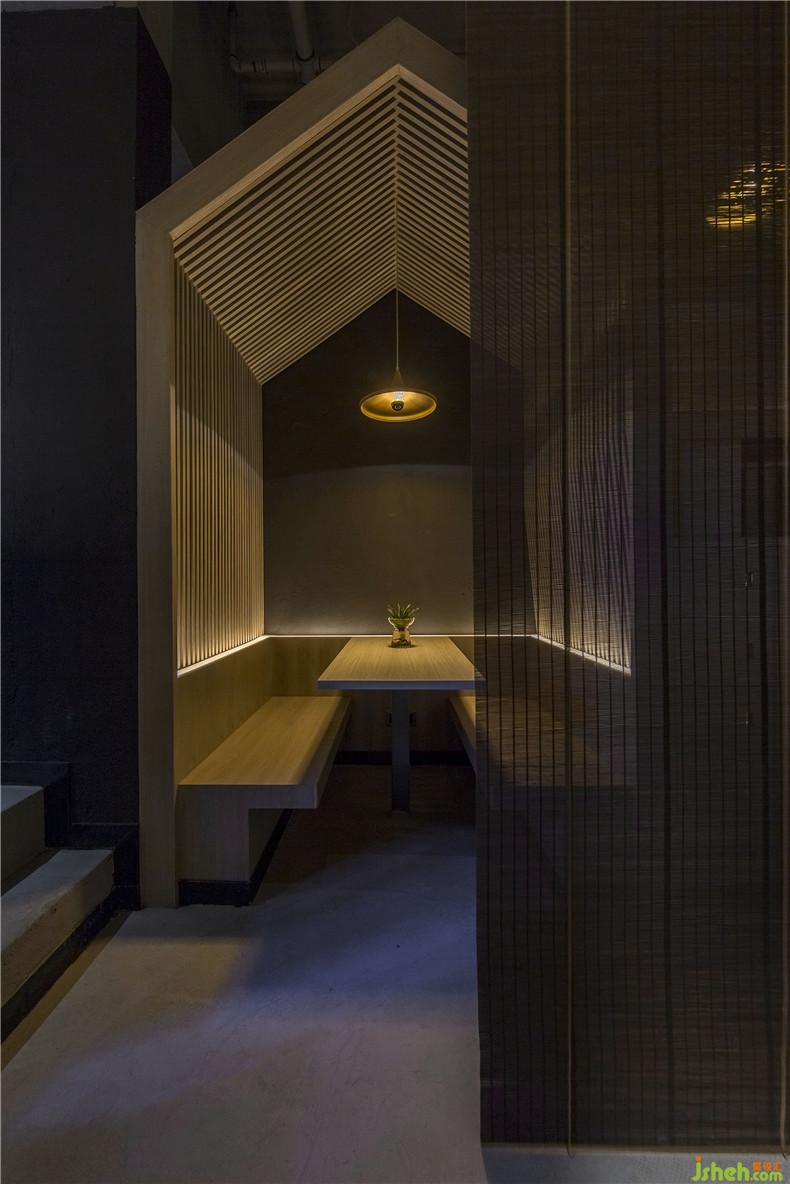 Designers in a narrow space to create a different space experience, different tea partition, with a different experience, a person is tea and tea dialogue, two people drink tea, is the exchange of people, There is a card position, the height of the hut, tatami, and further meet the people's privacy requirements. And clever use of buildings between the narrow, creating water view bamboo.