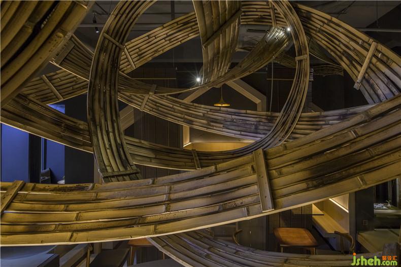 用中國傳統(tǒng)的草書作藍(lán)本,用竹片作墨,在空間揮寫,形成獨特的空間裝置藝術(shù),粗礦而張揚,以木格柵的直線條與之形成曲與直的強(qiáng)烈的對比,顯得空間有更豐富層次感和節(jié)奏感。
