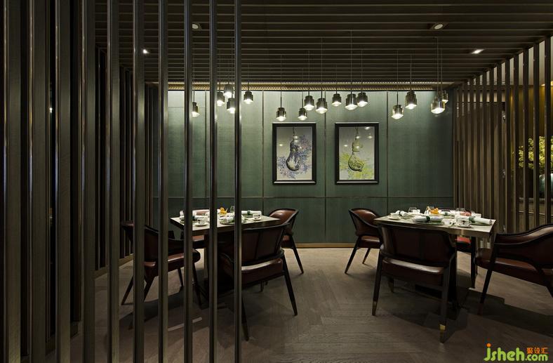 同層的另一邊是開放式亭閣,為客人劃分出靜謐怡人的半私密用餐空間。亭閣的天花掛著訂造的不銹鋼吊燈,燈光映照著木質(zhì)欄柵的弧線光影,投射于富有質(zhì)感的墨綠墻身之上,營造層次豐富的視覺效果。