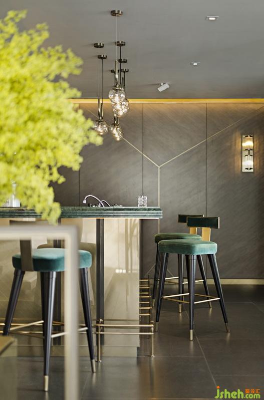 餐廳樓高兩層,甫進大門即見氣派古典的酒吧大堂,設(shè)計師以別于傳統(tǒng)中式餐廳的大氣格局,利用簡約流麗的筆觸勾勒低調(diào)而華貴的格調(diào)。地面選用沉實的意大利黑麻石鋪設(shè),磚塊之間以細膩的金色線條點綴,配搭黃銅色不銹鋼面的墻柱及精心設(shè)計的金屬柵格,盡顯摩登氣質(zhì)。