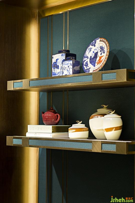 踏上云石梯級來到一樓,是恬靜優(yōu)雅的用膳空間。地板以煙熏深灰色橡木鋪設(shè),配搭灰色影木皮墻身與實木框線。接待處的設(shè)計別出心裁,柜臺背景墻以藍綠色布藝配襯香檳色金屬層架,配以印著中國傳統(tǒng)圖案的器皿擺設(shè),迎接蒞臨的客人。