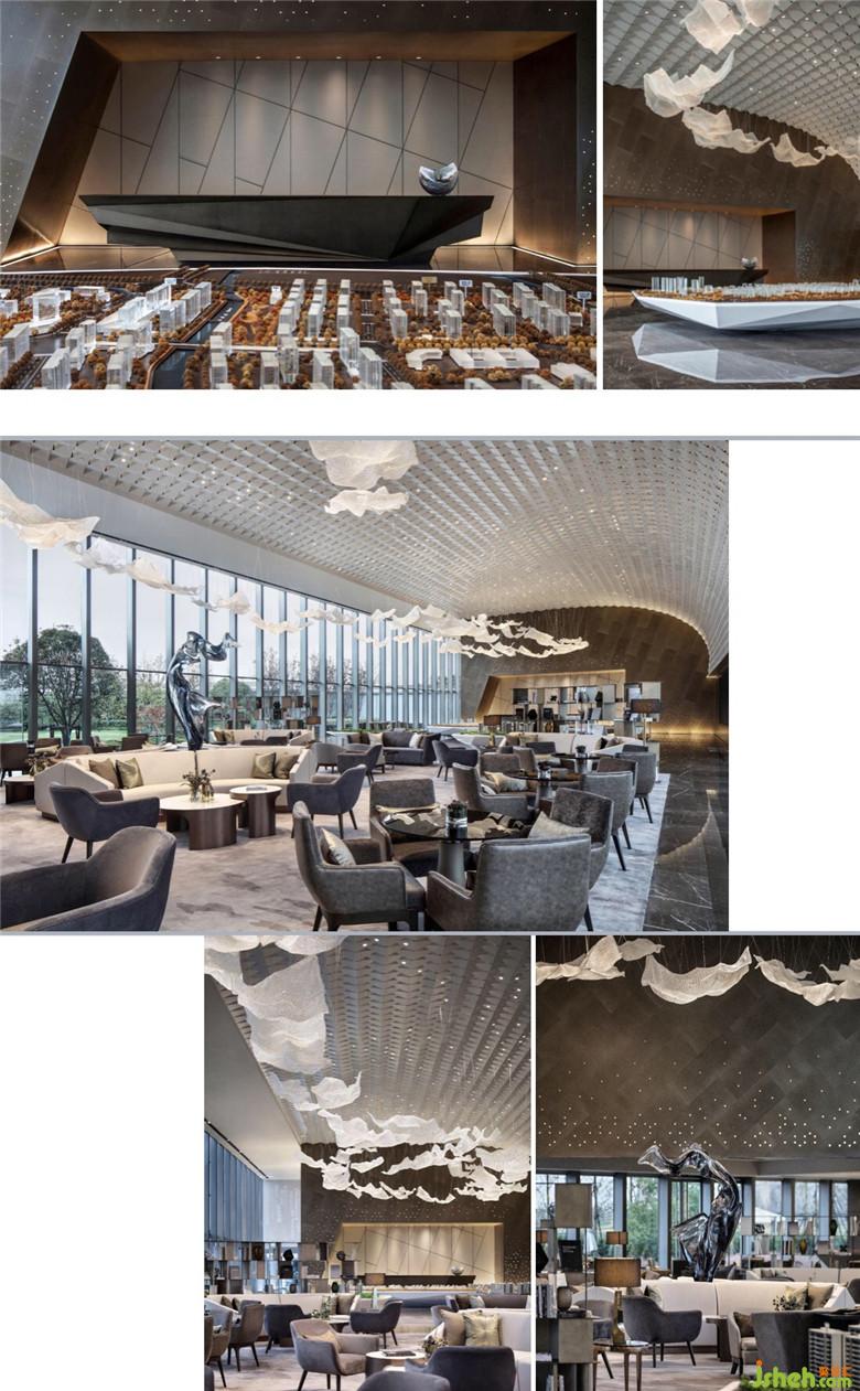 隨后張力老師和我們分享了案例上海融創(chuàng)唐鎮(zhèn)展示中心,張力老師著手于該空間設(shè)計(jì)的最初構(gòu)想時(shí),希望打破的是對(duì)售樓處的固有印象,探索更多的可能性,用更前端、更具話(huà)題性的表現(xiàn)形式,去模糊商業(yè)與藝術(shù)空間的邊界。項(xiàng)目建筑本身?yè)碛袠O具造型感和藝術(shù)性外形,希望這種原始、純粹的張力從建筑外部延伸到室內(nèi)空間。以雕塑般的造型及內(nèi)部豐富的空間和光影,希望帶給觀者驚艷的背后是獨(dú)特的空間體驗(yàn)。設(shè)計(jì)以精妙絕倫的造型展開(kāi),彰顯建筑與自然的融合新生,詮釋尊崇展廳的價(jià)值座標(biāo)。在極具深度的變化中營(yíng)造空間序列,前廳的第一視感是形成整個(gè)空間氣質(zhì)的起點(diǎn),墻面與天花的立體折型設(shè)計(jì)和強(qiáng)烈造型感的空間結(jié)構(gòu),極具視覺(jué)沖擊力。光線(xiàn)從墻面穿孔鋁板透出,與山石吊飾造景形成獨(dú)特韻味,疏影斑駁靈動(dòng)。摒棄多余的陳設(shè),以極具現(xiàn)代感的藝術(shù)裝置去迎合空間本身的靈動(dòng),搭出極具視覺(jué)沖擊力的多元層次,完成空間的藝術(shù)化表達(dá)。