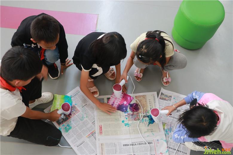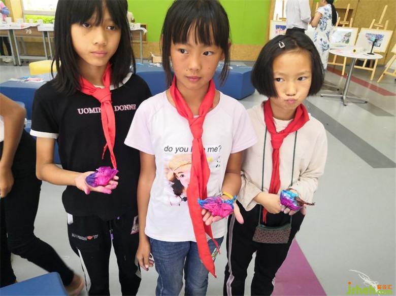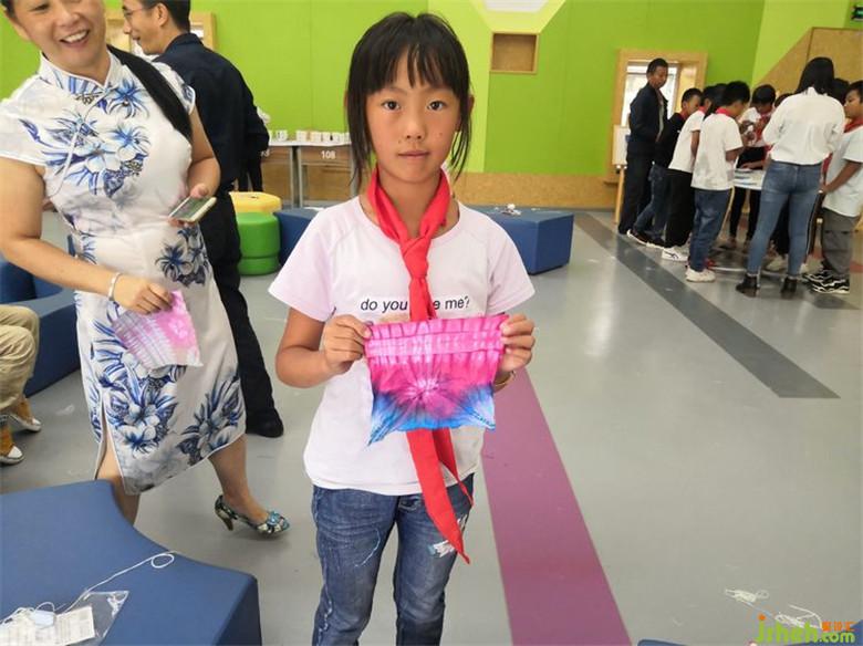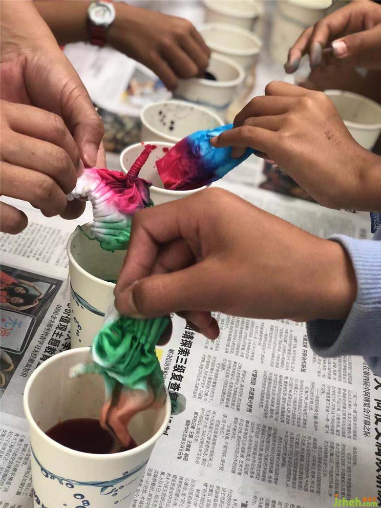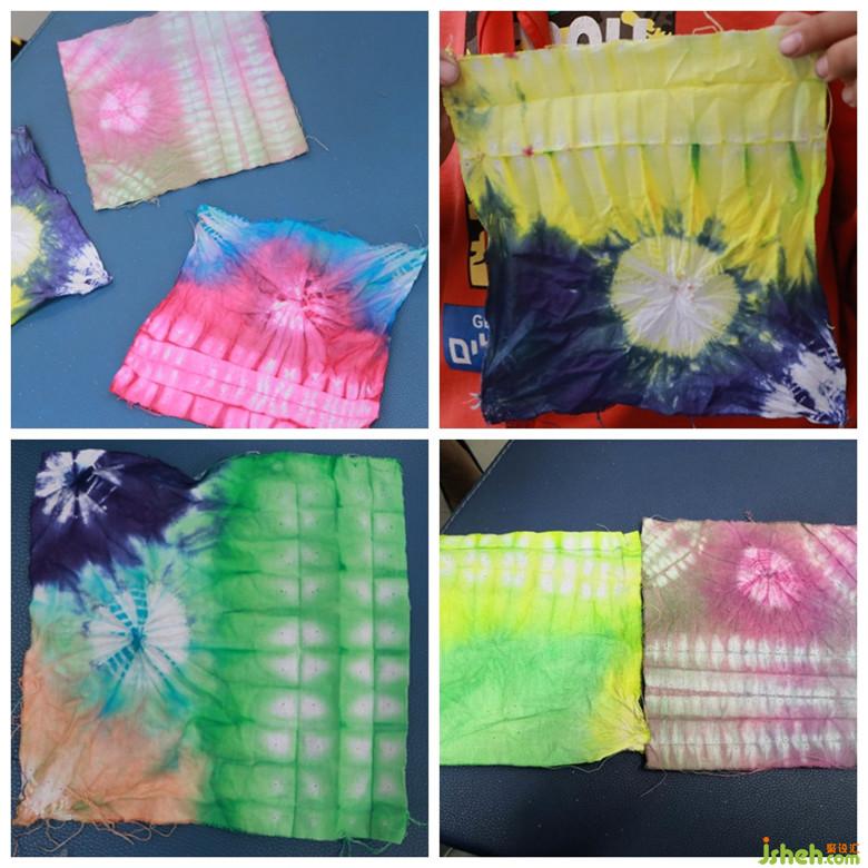 扎花完成以后,便可以進行浸染了。孩子們跟隨老師把捆扎成型的作品放到自己心儀的染料中去浸泡。靜待15-20分鐘后,作品成功染色,孩子們都期待地把“小疙瘩”撈出來,沖洗,解捆。打開“小疙瘩”的瞬間,這些樸拙的小孩驚異于扎染的神奇:原本平淡無奇的一方方白布在捆扎的作用下形成了以花形為中心,變幻玄妙的多層次暈紋,形狀各異,絢麗多彩,極具藝術性!