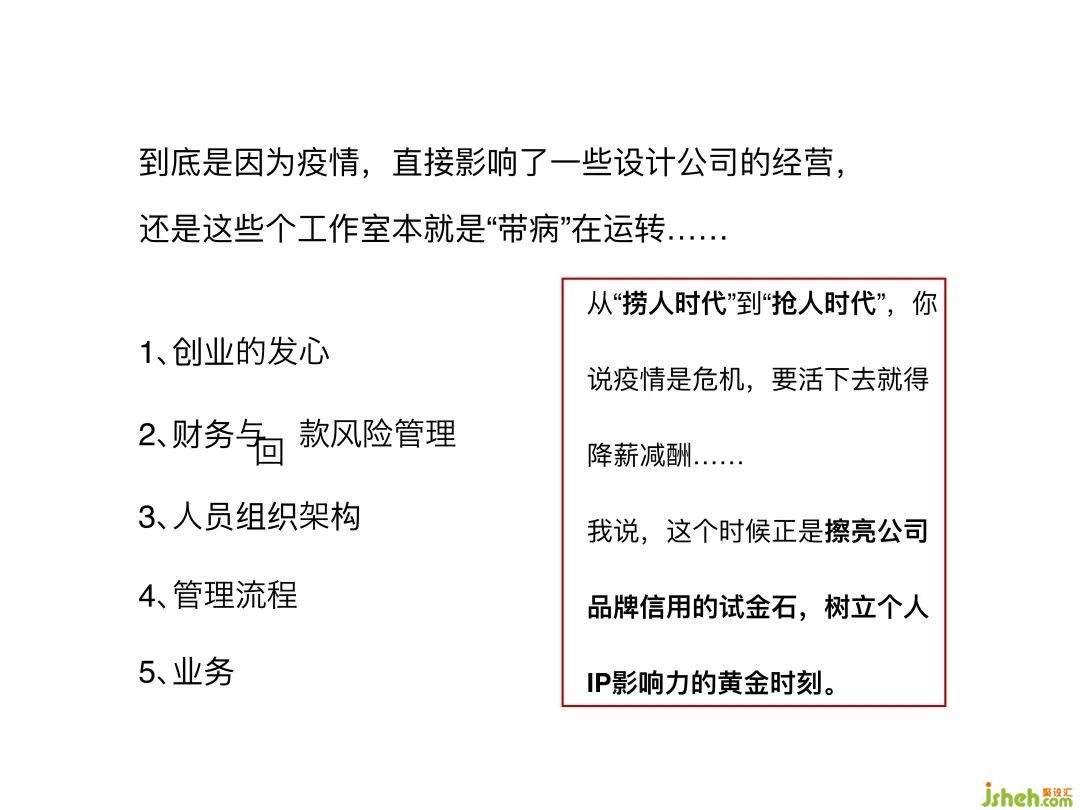 疫情是一面鏡子,一個(gè)公司經(jīng)營(yíng)得好與壞也是一面鏡子,它能夠反映出經(jīng)營(yíng)者的心態(tài)。其實(shí)不是因?yàn)橐咔橛绊懥艘恍┰O(shè)計(jì)公司的經(jīng)營(yíng),而是這些工作室本就是“帶病”在運(yùn)轉(zhuǎn)。