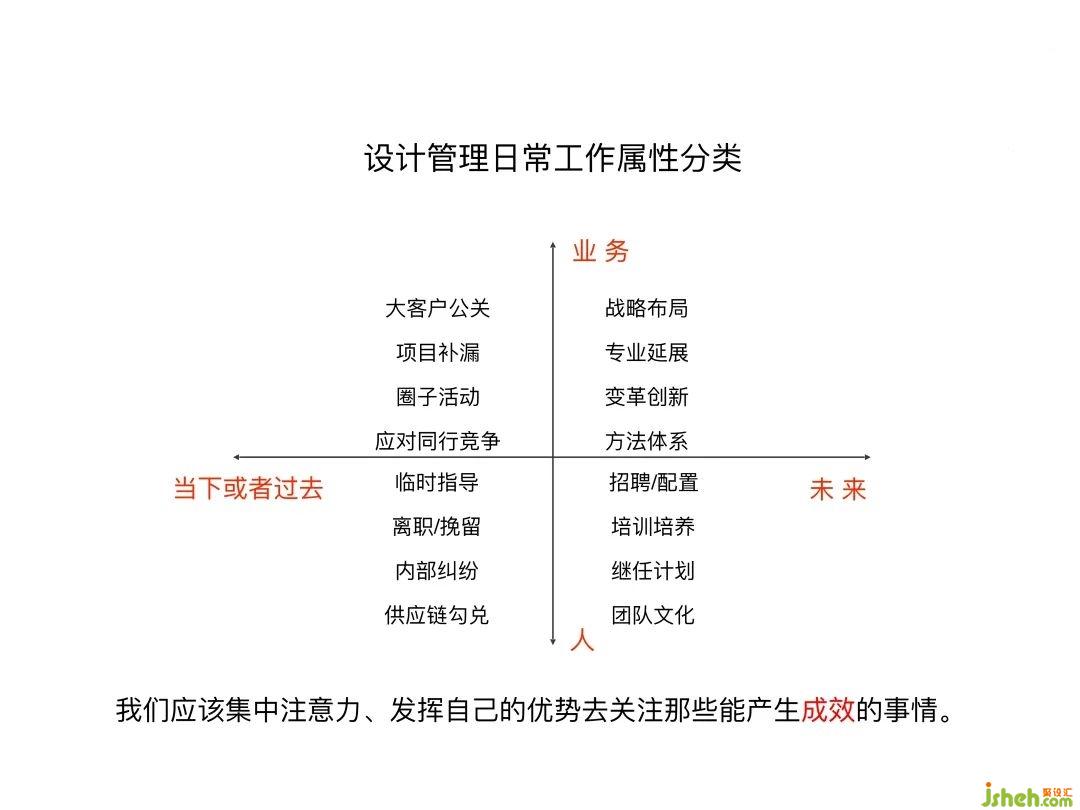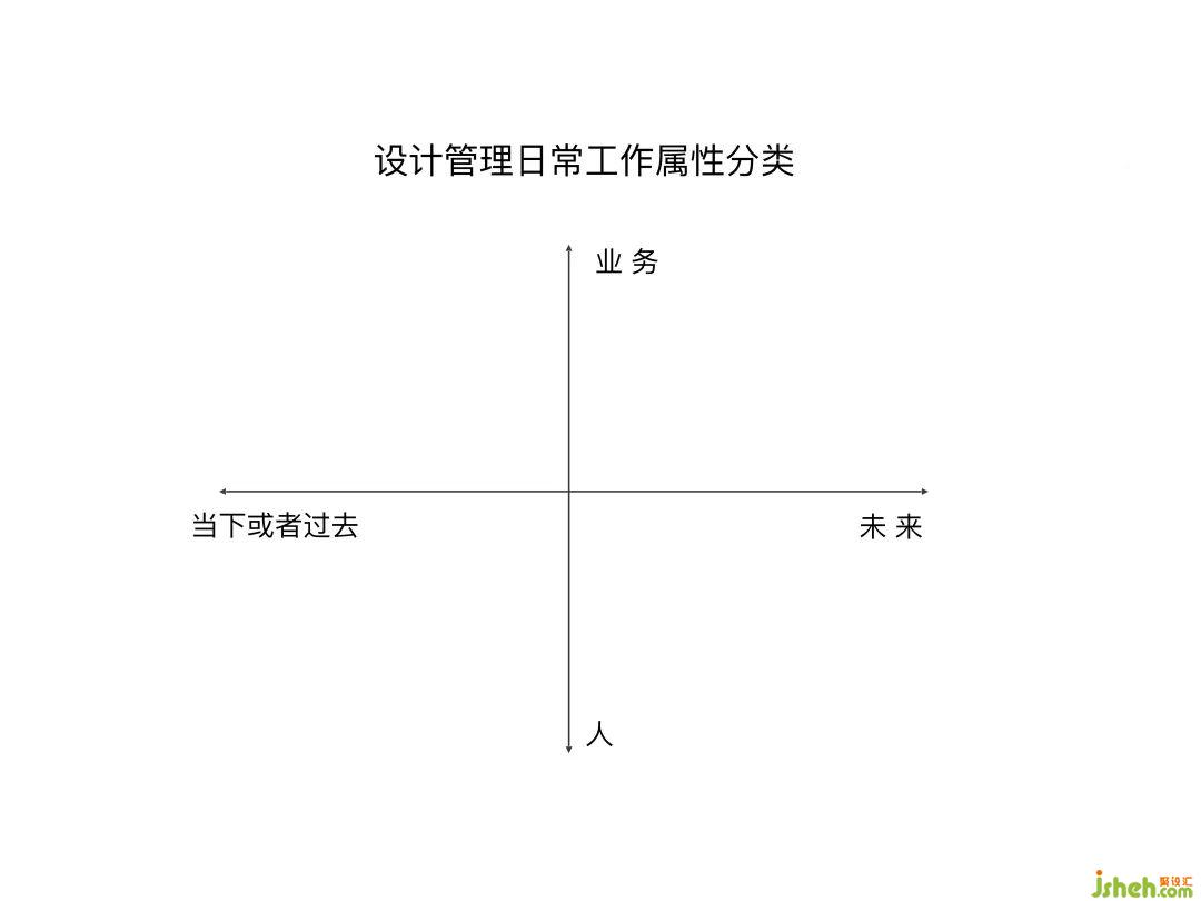 這個(gè)是我做的關(guān)于一個(gè)設(shè)計(jì)公司管理者的日常工作屬性分類(lèi)。為什么大家現(xiàn)在會(huì)對(duì)未來(lái)充滿(mǎn)迷茫和焦慮,是因?yàn)槲覀冏鳛楣窘?jīng)營(yíng)者把更多的精力放在了過(guò)去和當(dāng)下,而沒(méi)有立足于未來(lái)去做布局。