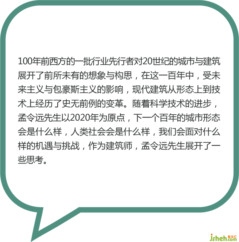 100年前西方的一批行業(yè)先行者對20世紀的城市與建筑展開了前所未有的想象與構(gòu)思,在這一百年中,受未來主義與包豪斯主義的影響,現(xiàn)代建筑從形態(tài)上到技術(shù)上經(jīng)歷了史無前例的變革。隨著科學(xué)技術(shù)的進步,孟令遠先生以2020年為原點,下一個百年的城市形態(tài)會是什么樣,人類社會會是什么樣,我們會面對什么樣的機遇與挑戰(zhàn),作為建筑師,孟令遠先生展開了一些思考。