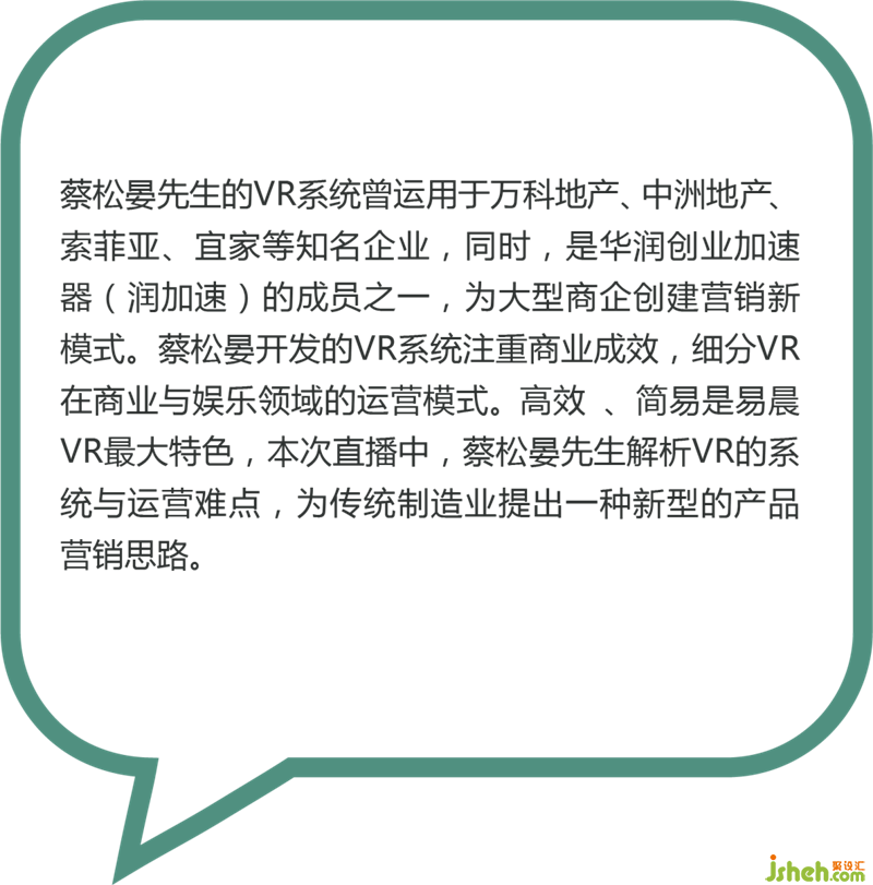 蔡松晏先生的VR系統(tǒng)曾運用于萬科地產(chǎn)、中洲地產(chǎn)、索菲亞、宜家等知名企業(yè),同時,是華潤創(chuàng)業(yè)加速器(潤加速)的成員之一,為大型商企創(chuàng)建營銷新模式。蔡松晏開發(fā)的VR系統(tǒng)注重商業(yè)成效,細分VR在商業(yè)與娛樂領(lǐng)域的運營模式。高效、簡易是易晨VR最大特色,本次直播中,蔡松晏先生解析VR的系統(tǒng)與運營難點,為傳統(tǒng)制造業(yè)提出一種新型的產(chǎn)品營銷思路。