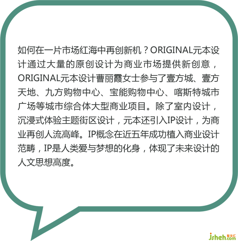 如何在一片市場紅海中再創(chuàng)新機?ORIGINAL元本設(shè)計通過大量的原創(chuàng)設(shè)計為商業(yè)市場提供新創(chuàng)意,ORIGINAL元本設(shè)計曹麗霞女士參與了壹方城、壹方天地、九方購物中心、寶能購物中心、喀斯特城市廣場等城市綜合體大型商業(yè)項目。除了室內(nèi)設(shè)計,沉浸式體驗主題街區(qū)設(shè)計,元本還引入IP設(shè)計,為商業(yè)再創(chuàng)人流高峰。IP概念在近五年成功植入商業(yè)設(shè)計范疇,IP是人類愛與夢想的化身,體現(xiàn)了未來設(shè)計的人文思想高度。