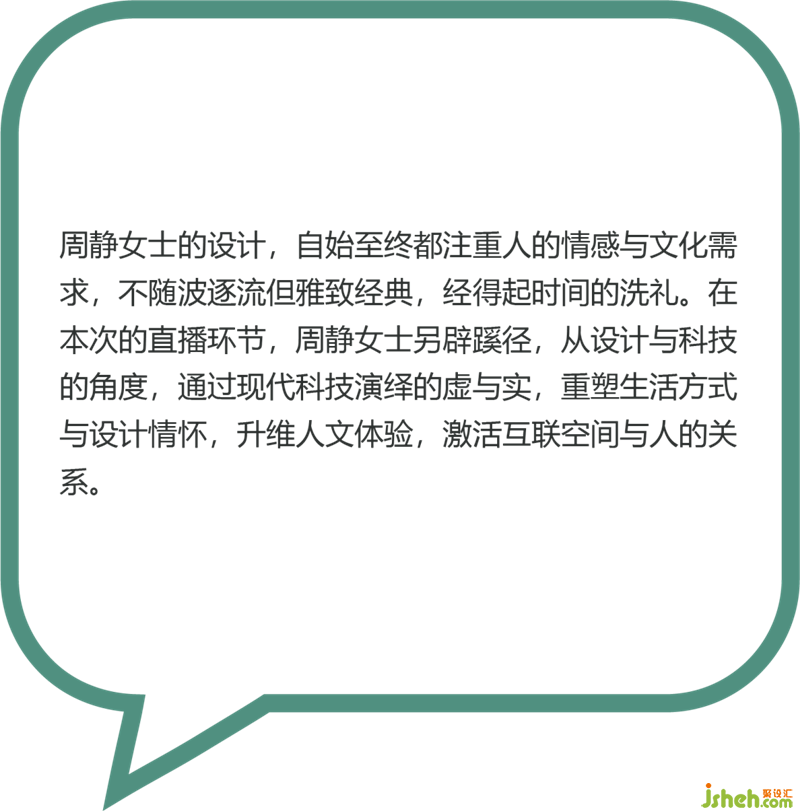 周靜女士的設(shè)計,自始至終都注重人的情感與文化需求,不隨波逐流卻雅致經(jīng)典,經(jīng)得起時間的洗禮。在本次的直播環(huán)節(jié),周靜女士另辟蹊徑,從設(shè)計與科技的角度,通過現(xiàn)代科技演繹的虛與實,重塑生活方式與設(shè)計情懷,升維人文體驗,激活互聯(lián)空間與人的關(guān)系。