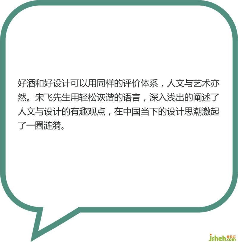 好酒和好設(shè)計可以用同樣的評價體系,基酒,調(diào)酒工藝,容器,窖洞,年份是窖藏酒的關(guān)鍵詞,設(shè)計與人文亦然。宋飛先生用輕松詼諧的語言,深入淺出的闡述了人文與設(shè)計的有趣觀點,為中國當(dāng)下的設(shè)計思潮激起了一圈漣漪。