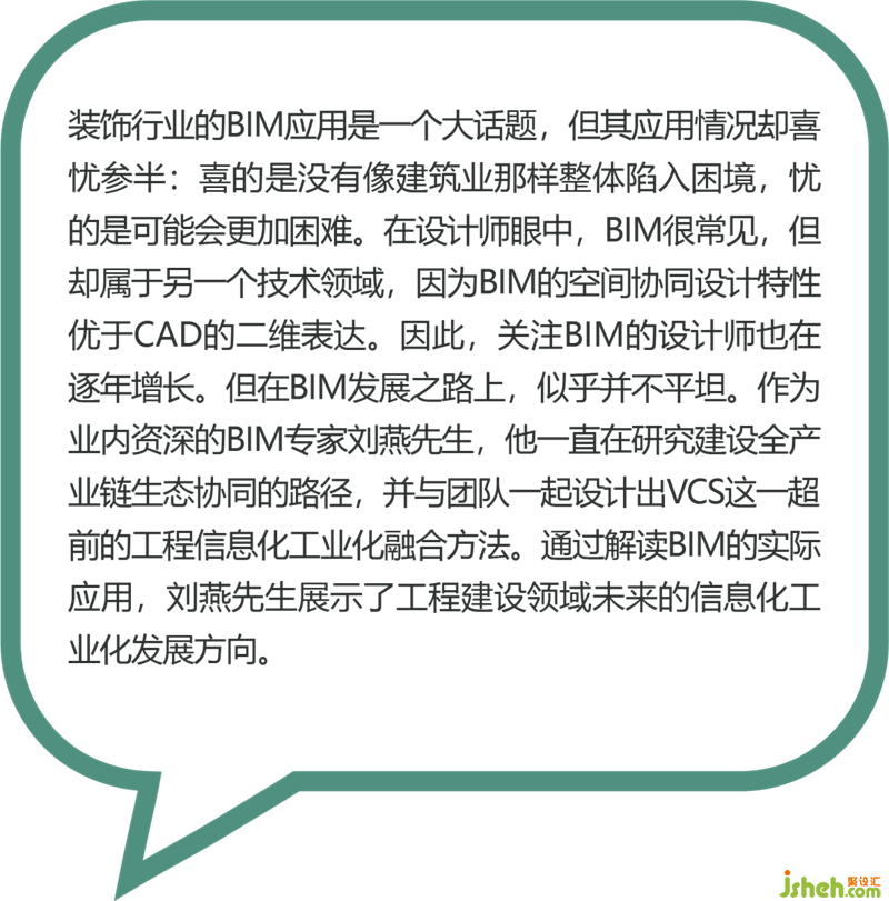 裝飾行業(yè)的BIM應(yīng)用是一個大話題,但其應(yīng)用情況卻喜憂參半:喜的是沒有像建筑業(yè)那樣整體陷入困境,憂的是可能會更加困難。在設(shè)計師眼中,BIM很常見,但卻屬于另一個技術(shù)領(lǐng)域,因為BIM的空間協(xié)同設(shè)計特性優(yōu)于CAD的二維表達。因此,關(guān)注BIM的設(shè)計師也在逐年增長。但在BIM發(fā)展之路上,似乎并不平坦。作為業(yè)內(nèi)資深的BIM專家劉燕先生,他一直在研究建設(shè)全產(chǎn)業(yè)鏈生態(tài)協(xié)同的路徑,并與團隊一起設(shè)計出VCS這一超前的工程信息化工業(yè)化融合方法。通過解讀BIM的實際應(yīng)用,劉燕先生展示了工程建設(shè)領(lǐng)域未來的信息化工業(yè)化發(fā)展方向。