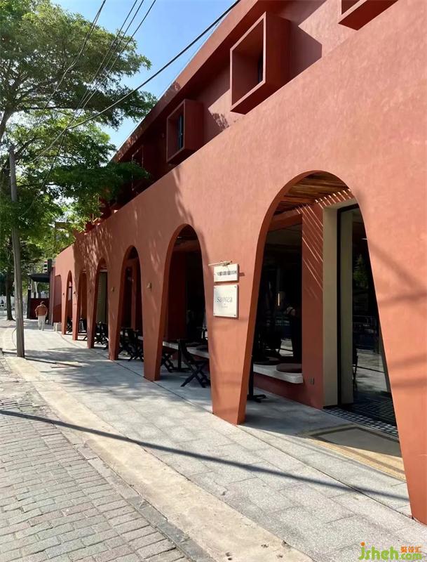苫也外立面解構(gòu)重筑,木梁與拱形門洞,搭配出一組戶外好時光。整個建筑被赪霞色包裹,遠(yuǎn)遠(yuǎn)望去,似海灘上的一朵云霞,在陽光下綻放不一樣的光芒。