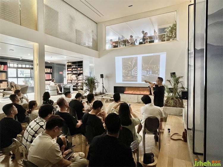 在和陳熠老師短短幾個(gè)小時(shí)的交流中,不難看出他是一個(gè)從精神到靈魂都需要找尋知己的人,不需要過(guò)多話語(yǔ),同頻的人自會(huì)和你產(chǎn)生靈魂層面的共振。陳熠老師以他的作品《保利二十四院》為例和在座的青年設(shè)計(jì)師一起探討了如何實(shí)現(xiàn)地下空間的使用率和提升舒適度,他大膽“實(shí)驗(yàn)”,將天井玻璃改造為魚池,水波紋和魚的影子如同天然形成的動(dòng)態(tài)水墨畫,與室內(nèi)融為一體,一切都顯得那么自然又充滿了禪意。