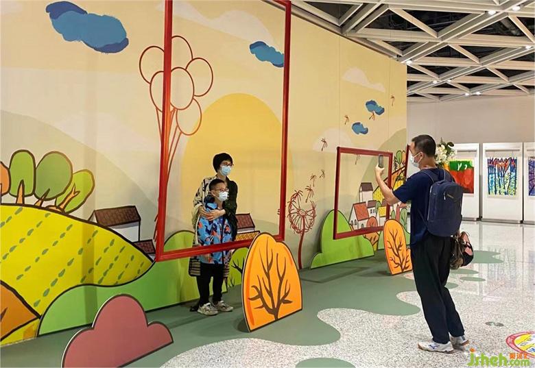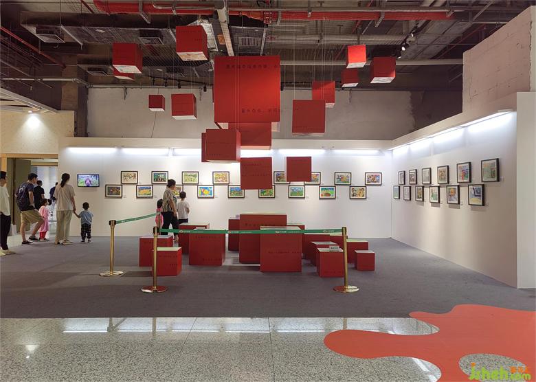 紅色的裝置藝術(shù)點(diǎn)綴在畫展區(qū)域中心,一組大小不一的盒子從天而降,每個(gè)盒子底部為孩子們的畫作。地面上放置的另一組裝置,盒子的頂部是孩子們的畫作,與天花上落下的盒子遙相呼應(yīng),形成了一個(gè)自然融合的整體。盒子的周邊展示的是孩們手寫的話語(yǔ),展示了他們天真無(wú)邪、快樂(lè)自由的生活態(tài)度。