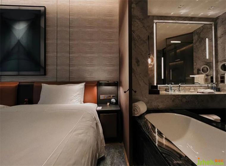 300間典雅奢華客房及套房,擁有花園城市和波瀾海灣景觀,從森系原木地板、中式屏風(fēng)格柵、亞麻針織質(zhì)感背景墻與掛毯,到臥室和浴室間水墨暈染出的美學(xué)連通門,方寸之間無(wú)不展現(xiàn)出Yabu鮮明的設(shè)計(jì)語(yǔ)言。