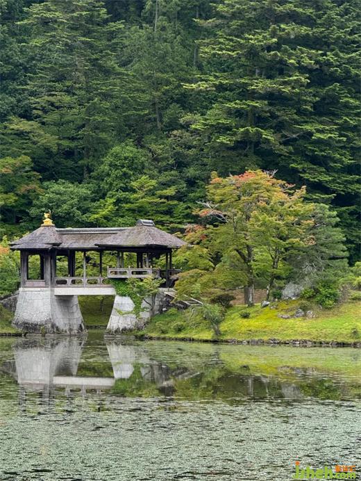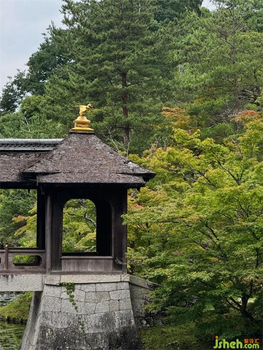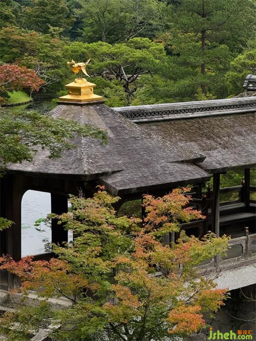 全園的祈壽主題非常明顯,有壽月觀、神仙島(一池三島)、千歲橋等主要景點,透過這些景名,那位當年已63歲還在造園的后水尾上皇的晚年心情也可略見一斑。在這里,他一邊凝望著月亮,一邊作詩,就這樣度過著他的歲月。從這個有著水流和叮咚作響的瀑布的下庭園中,你可以沿著一條兩邊樹木林立的小徑來到中間的一個庭園。這兒的小亭中有一幅著名的魚畫,那魚逼真得就像有一張畫出的網在罩住它們,不讓它們游走一樣。最后你到達云亭,在此能觀賞到令人心顫的美麗全景:上庭園散落著湖、橋、瀑布、小島和精巧的亭子,這些形成了前園;后面是京都城,背靠重重群山。