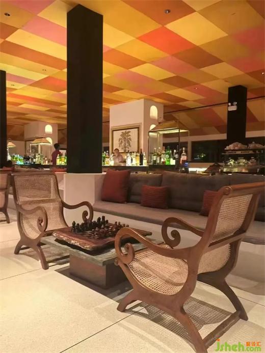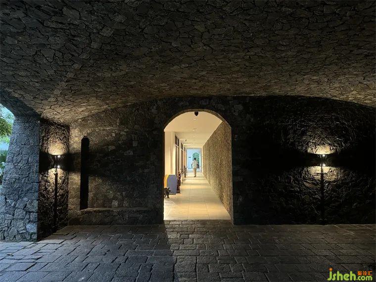 基座層是由毛石砌筑而成的“堡壘”,內(nèi)部空間有種厚實的洞穴感。二層是以四面圍合的水庭院為中心的公共區(qū)域,這一層的陳設(shè)設(shè)計得非常適度,繁復(fù)而不油膩。三層往上則是層層向外懸挑的客房區(qū)域,舉重若輕地漂浮。裝修設(shè)計