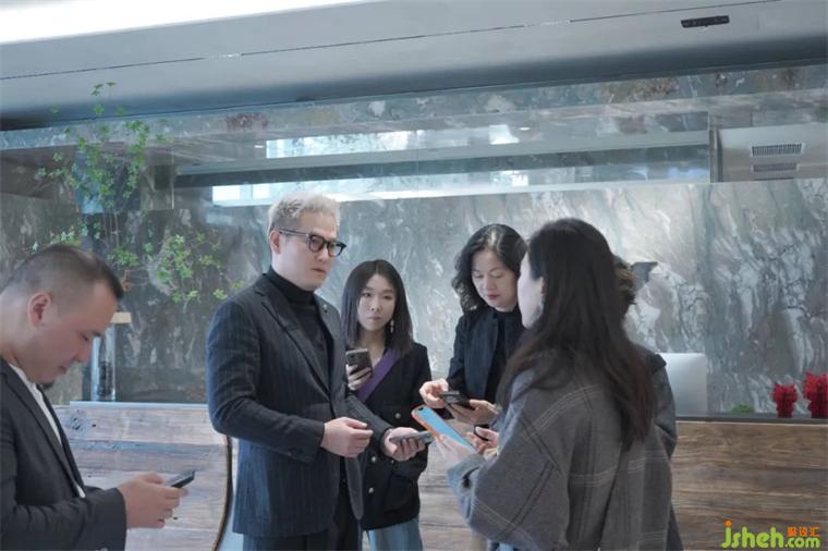 26號上午10點到達此次出行的第二站——集艾設計,九樓大廳中間一個手提箱中噴薄而出的白色絲網(wǎng)式設計別具一格,李陽介紹到這個造型叫“才思泉涌”,象征著集艾向全國各地輸送創(chuàng)意,公司選址在虹橋機場附近也是考慮到更方便全國跑業(yè)務。