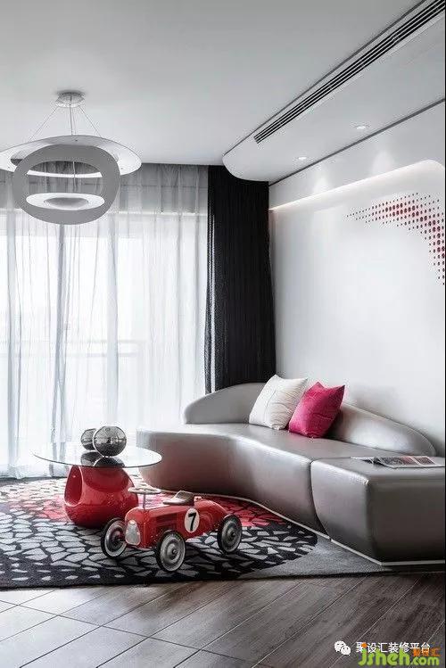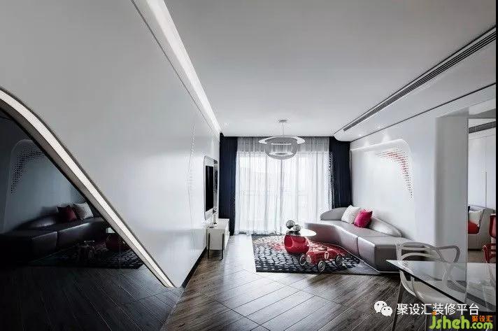 流暢的弧線形,酷炫的金屬感,醒目的大紅色。整個(gè)客廳的設(shè)計(jì)給人視覺感官的第一印象,是熱情與活力。年輕一代在快節(jié)奏的生活里,用各種引領(lǐng)潮流的元素去釋放生活的張力。漂移,加速度,在這個(gè)快速轉(zhuǎn)換的時(shí)代里活出自我,才符合當(dāng)下對(duì)于生活追求的新定義。