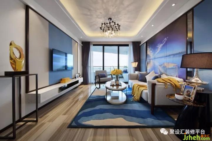 在別墅裝修設(shè)計(jì)中客廳設(shè)計(jì)中設(shè)計(jì)師試著借用海洋藍(lán)的對(duì)比色檸檬色作為空間的跳躍色,為空間注入富有活力的情緒,形成理性與感性的交織,使整個(gè)空間飽滿而豐富,再以紋理大氣的胡桃木搭配皮革、棉麻,形塑出自由溫暖的生活態(tài)度。