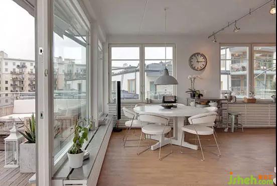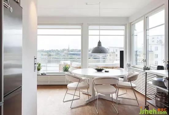 編輯點(diǎn)評(píng):在全方位的落地窗的映襯下,小小的餐廳不僅采光好,而且看起來(lái)開(kāi)闊明亮,整體白色的餐桌和餐椅讓這份明亮貫穿到底。