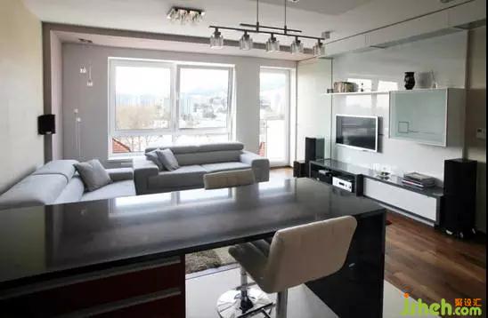編輯點(diǎn)評(píng):吧臺(tái)放置于此,即作為客廳與廚房的隔斷,也可作為餐桌,一舉兩得。