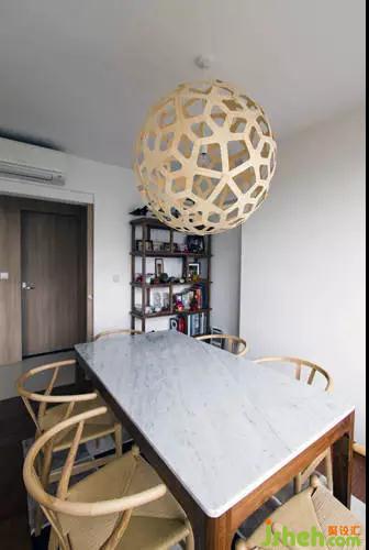 編輯點(diǎn)評(píng):公寓餐桌處的設(shè)計(jì)依舊符合公寓的一貫風(fēng)格,米色的藤椅以及木身大理石桌面的餐桌,此外餐桌上方的吊燈也是一大亮點(diǎn),獨(dú)特的造型猶如一個(gè)籠子將燈泡包圍在其中。