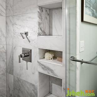 在墻上鑿開格子做入墻式的收納柜,是現(xiàn)在不少浴室裝修的新選擇。一些肥皂化妝品等小體積的物品也可以借助收納筐放置在這些柜子之中。