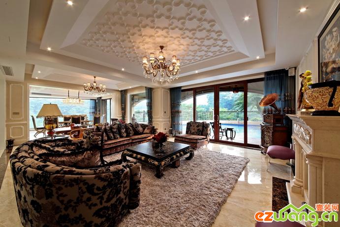 混搭風(fēng)格是一種可以滿足多人對(duì)家的幻想的設(shè)計(jì)方式,客廳的設(shè)計(jì)方向偏于歐美形式,整塊的大花地毯在客廳中央,皮質(zhì)沙發(fā)相配,是典型的狂野中略帶氣質(zhì)的美式范,水晶吊燈自二樓吊下。