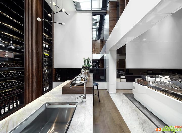 客廳采用挑空的設(shè)計(jì)布局,瞬間給人一種大氣、奢華的視覺感受,再配以時(shí)尚紋樣的藍(lán)色大理石作為墻地面的裝修用材,香檳金不銹鋼條作為點(diǎn)綴,奢侈品牌家私與精致配飾錦上添花,豐富色調(diào)的同時(shí)凸顯了空間的時(shí)尚典雅。陽光透過大落地玻璃窗照射進(jìn)來,通透的空間散發(fā)時(shí)尚奢華的氣質(zhì)。沿著客廳走向地下室,在鏡子不銹鋼等反射材料和墻面的抽象掛畫相映襯下,整體空間煥發(fā)著高貴時(shí)尚的氣息,同時(shí)也能感受到設(shè)計(jì)師對(duì)空間設(shè)計(jì)的熱愛與運(yùn)籌帷幄。整面品酒墻和寬大的吧臺(tái),滿足了主人對(duì)酒的熱愛和精致奢華的生活態(tài)度。