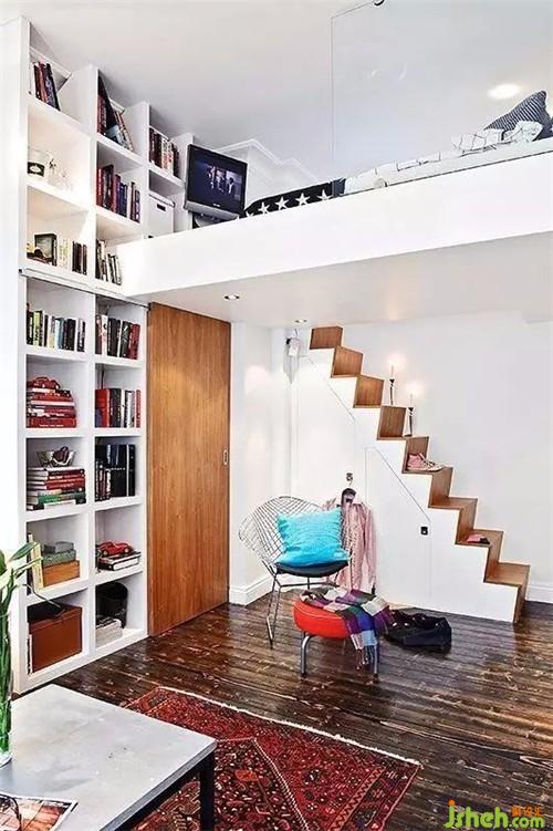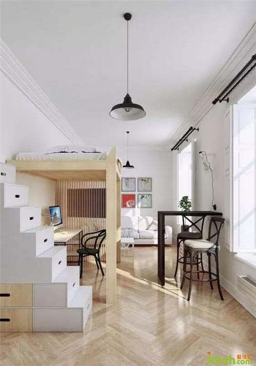 既然床占地方,那么室內(nèi)設(shè)計(jì)師需利用好縱向空間。把床設(shè)在二樓,搭個(gè)小梯子,樓梯恰好可以作為儲(chǔ)存柜使用,兩全其美!這樣一來,家里想有二樓其實(shí)不難嘛~~