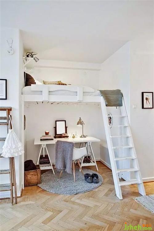 或者像學(xué)生宿舍一樣,采用上邊床,下邊辦公桌的方式,也能節(jié)省不少空間~