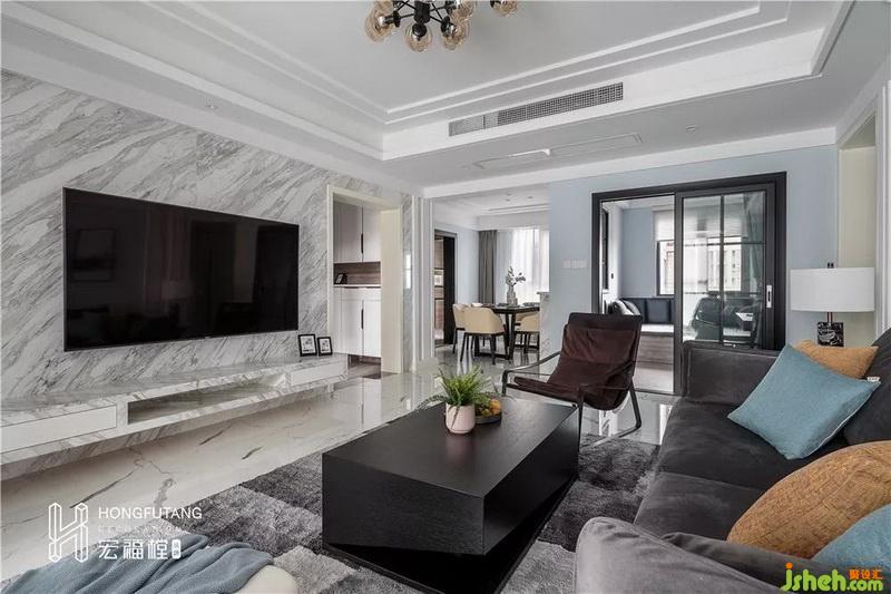 主材:盧森地板、鋼刷染色木飾面、爵士白大理石、費羅娜瓷磚