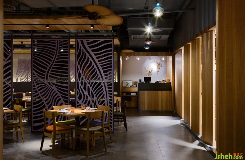 作品簡介:將元素抽象化后的隔屏作為視覺重心,視覺焦點并非以投射燈強調(diào),而是著重在反光和穿透的同時進行所造成的效果:明亮的周圍格柵由洗墻滲出反光,以及另一側(cè)穿透黑玻格柵的光線,加上本身格柵的紋路,創(chuàng)造了明暗乍現(xiàn)的芭蕉叢林內(nèi)外互望的氛圍。