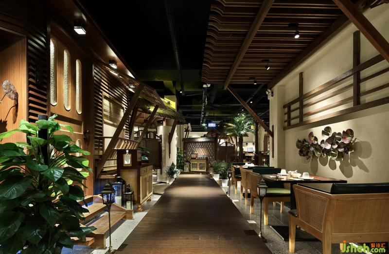 綠色植物點綴其中,原木質(zhì)感的村落營造東南亞風(fēng)情本餐廳,開敞式設(shè)計,獨特的東南亞小木屋配合綠植色彩營造獨特的異域風(fēng)情,非常不錯的餐廳設(shè)計!