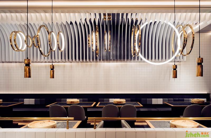 作品簡介:空間整體由曲線和直線線條構(gòu)成,室內(nèi)設(shè)計(jì)師巧妙地利用燈光效果,搭配金屬質(zhì)感的圓環(huán)裝飾,打造出一種燈火闌珊的視覺體驗(yàn)。