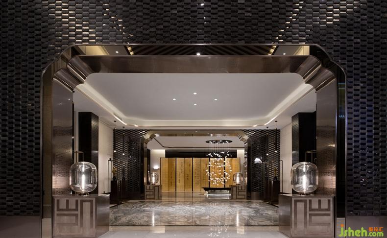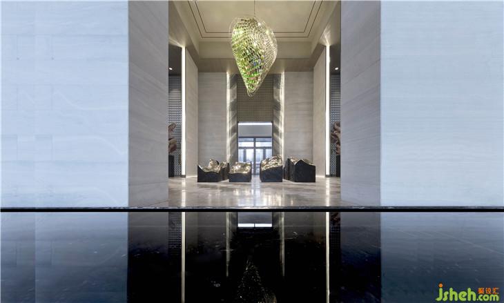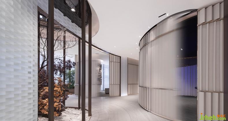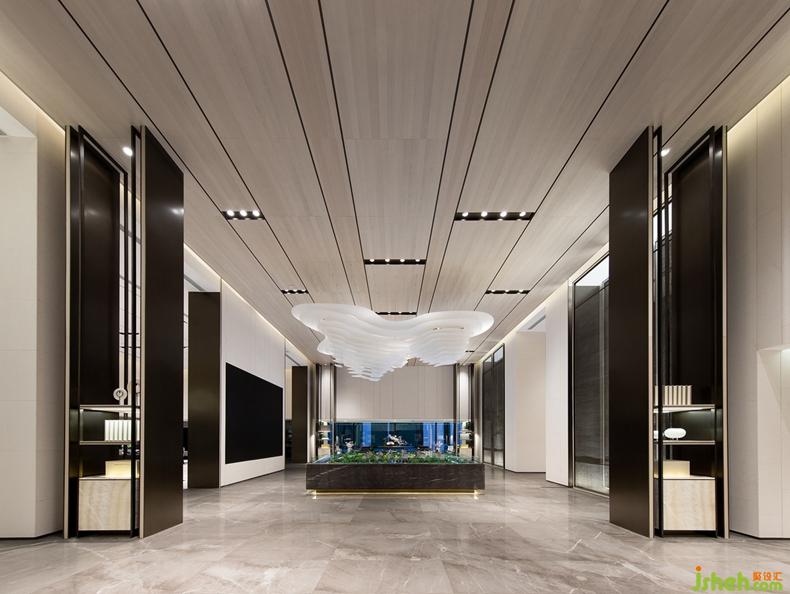 作品簡(jiǎn)介:暖褐色金屬門樓,創(chuàng)造禮儀感與品質(zhì)感的營(yíng)銷游覽動(dòng)線。簡(jiǎn)約大氣的冷灰色石材,流暢的水云紋理融入地面景觀空間,身處曲水流云的度假天境。入接待前廳,月洞形格柵屏風(fēng)運(yùn)用中式園林框景手法把院落景觀映入眼簾。精選紫山水大理石與鍛打山水紋的古銅接待臺(tái)完美契合,尊貴而高雅用現(xiàn)代手法展現(xiàn)禪意韻律。